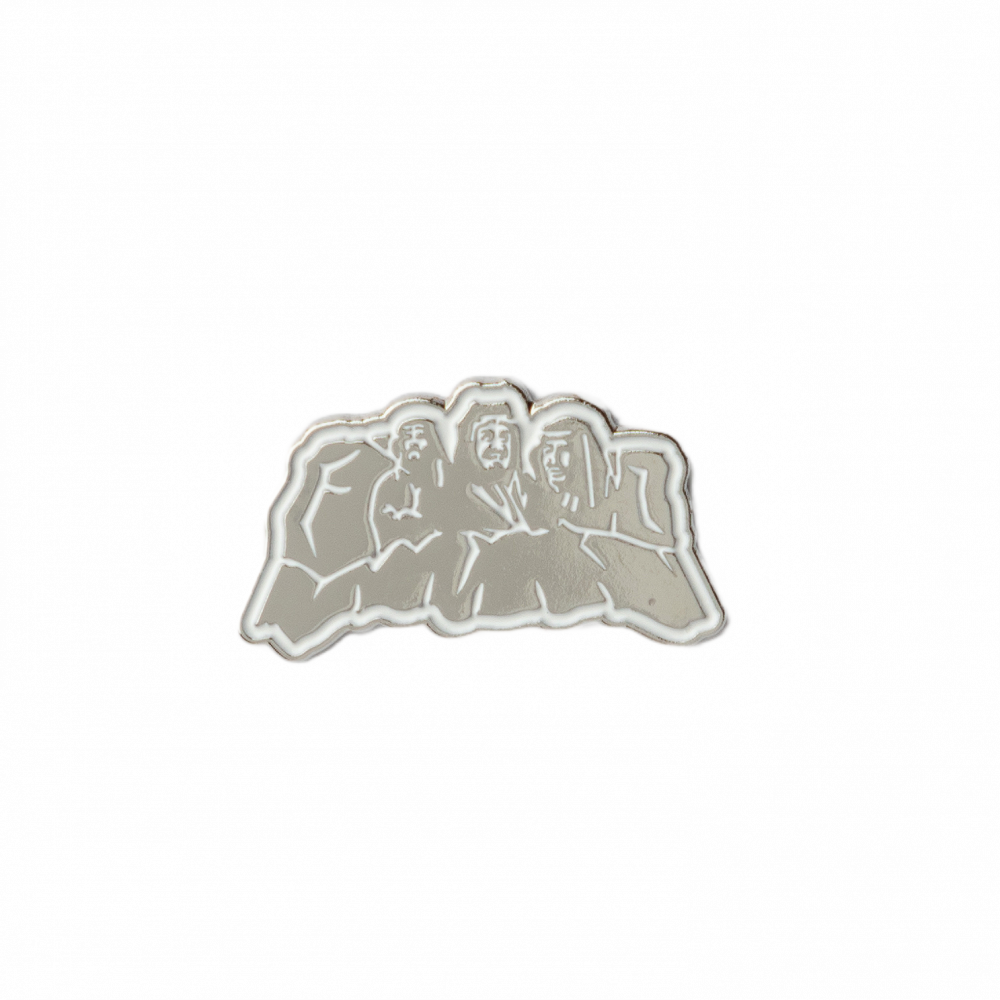 بروش معدني باللون الفضي يجمع الملك عبدالعزيز والملك سلمان والأمير محمد بن سلمان مع جبال طويق، محفور بدقة عالية وبحجم 3 سم