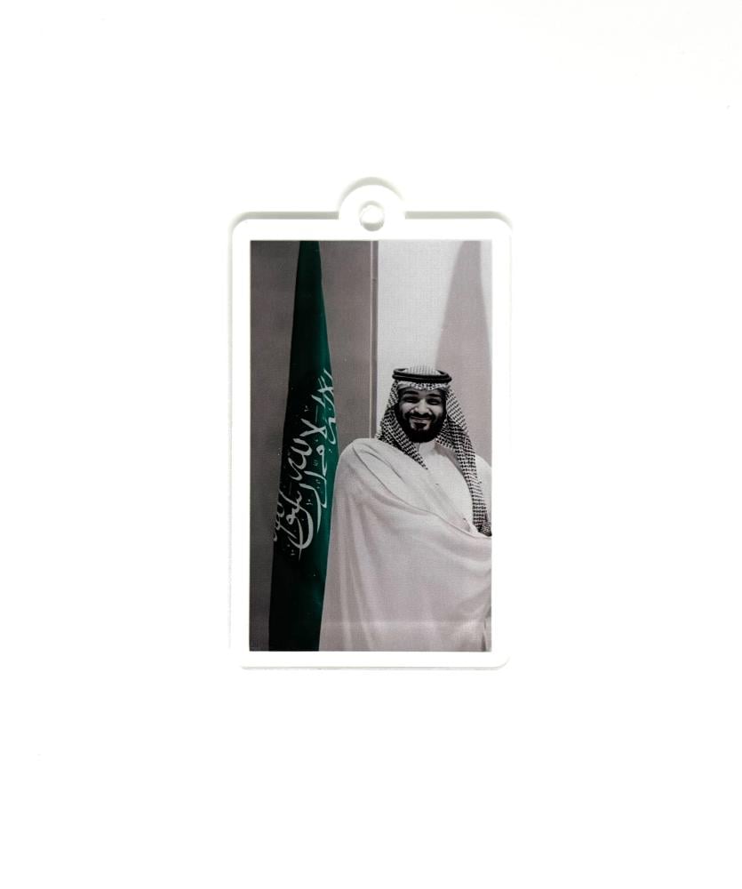 تعليقة اكريليك للسيارة بصورة ولي العهد الأمير محمد بن سلمان مطبوعة بتقنية اليزر UV لتكون مقاومة لحرارة الشمس، المقاس ١٠ سم